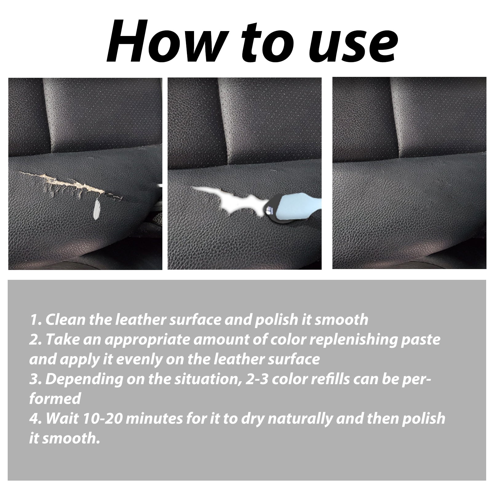 Our leather dye paste contains polyurethane resin, rosin, coconut oil, beeswax. It can change the color of the leather and restore the luster of the leather. Its use method is very simple: clean the leather surface and polish it smooth, take an appropriate amount of complementary cream evenly apply to the leather surface, according to different circumstances, you can perform 2-3 color fill, wait 10-20 minutes, let it dry naturally, and then polish it smooth. And can refurbish car seats leather sofas.