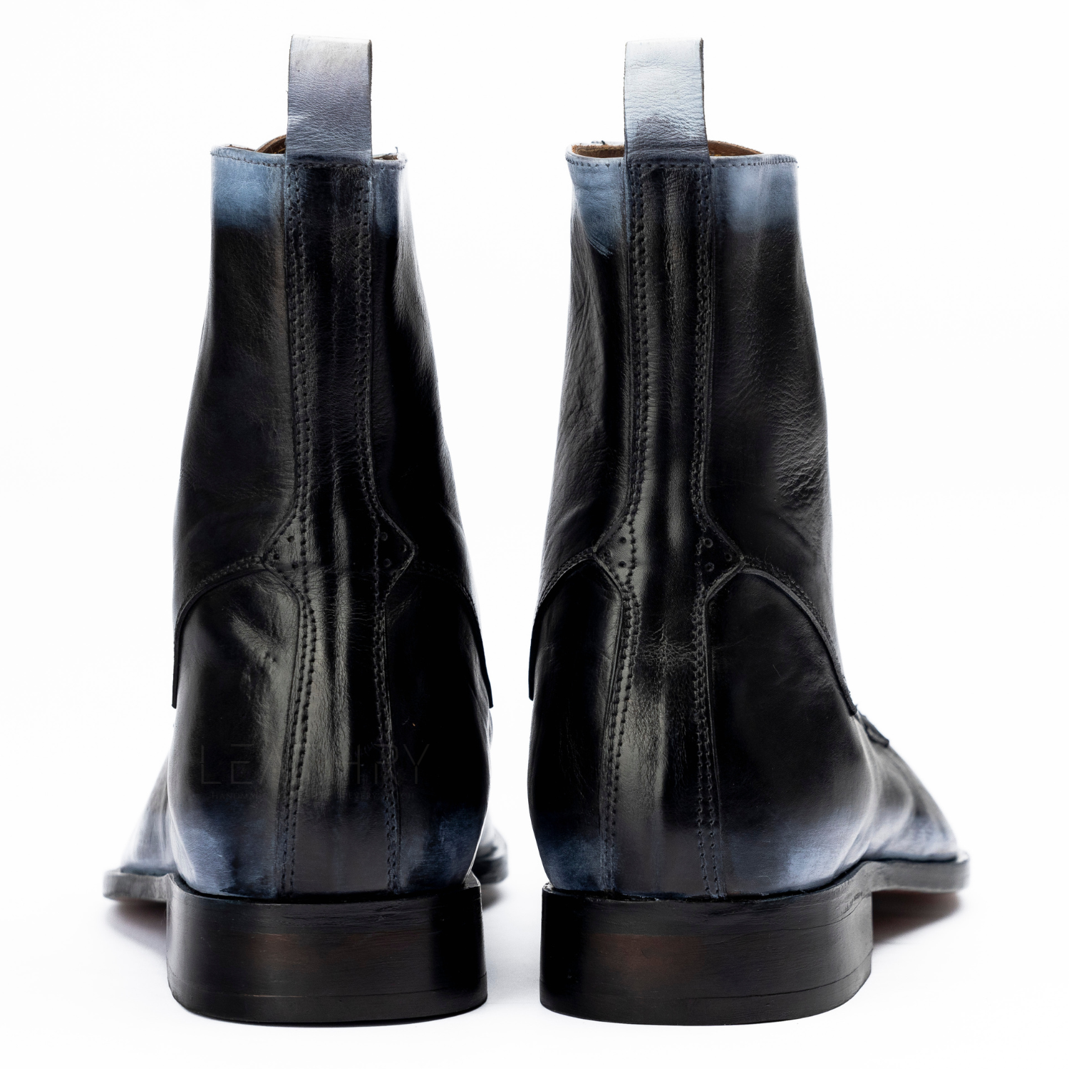 The Isen | Grey Burnish Hand Paint is a hand-painted men’s lace-up boot crafted from premium calf leather, featuring a grey and black patina finish, Goodyear welted sole, and almond toe design.
