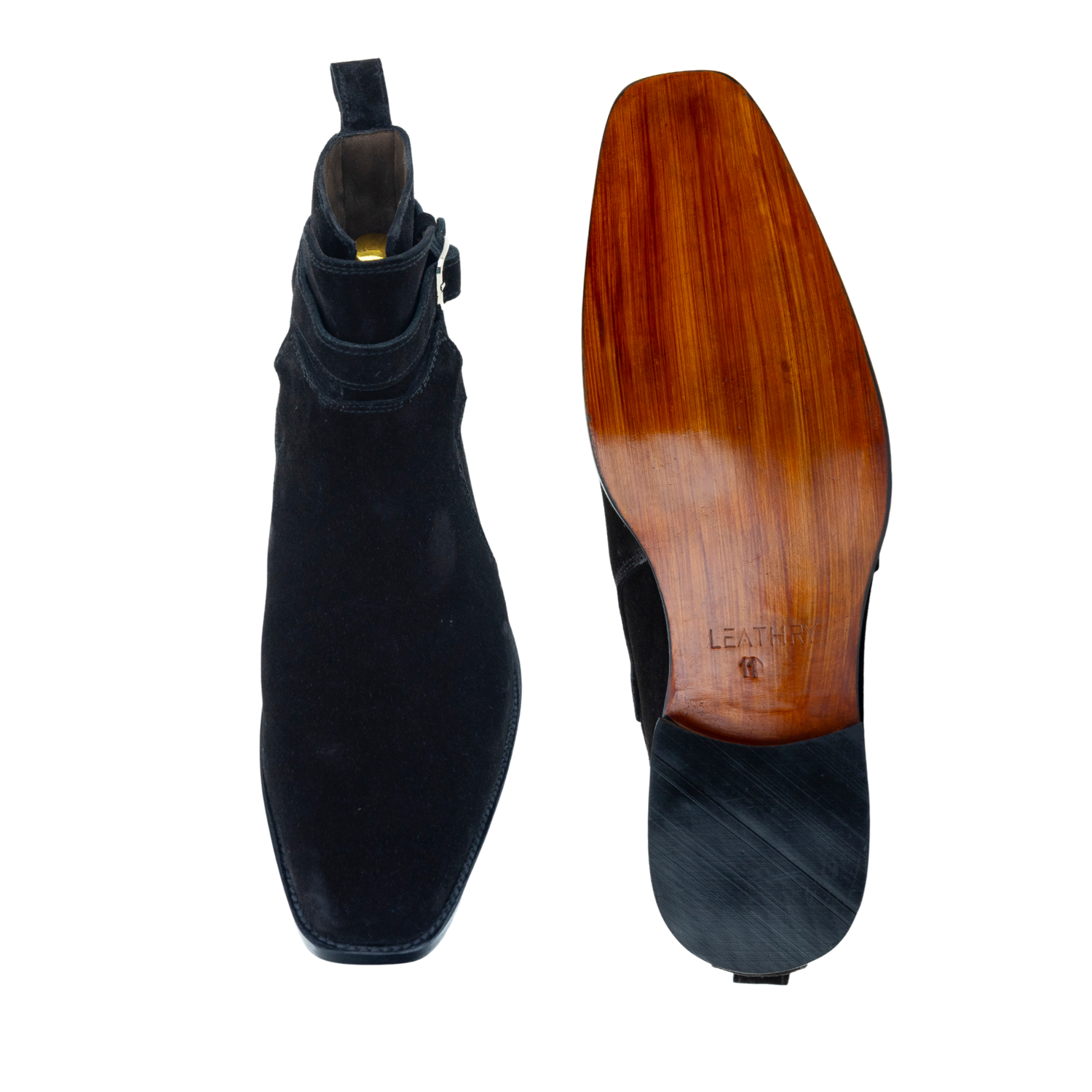 The Nolan boots combine luxurious black suede with a classic Jodhpur design, featuring a bold buckle strap and ankle-high silhouette. Handcrafted with premium materials and a Goodyear welted leather sole, these boots offer timeless elegance, comfort, and lasting durability.
