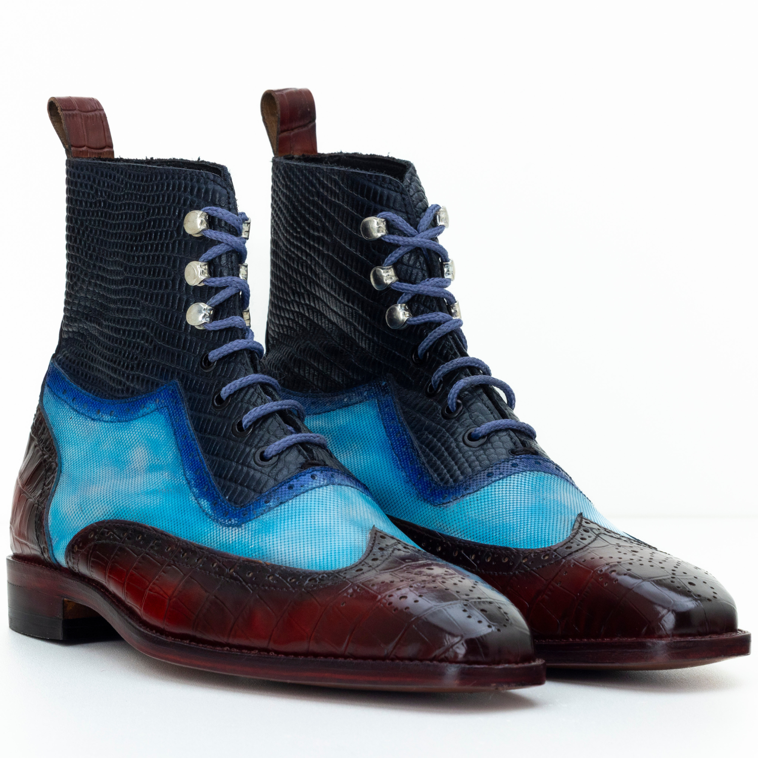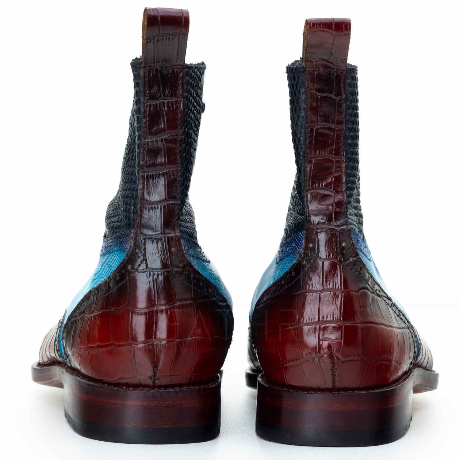 A bold fusion of color, texture, and craftsmanship — The Roald | Three Tone Wingtip blends purple croc-embossed leather, light blue burnish, and navy suede with a square toe, Goodyear welted sole, and full brogue styling. Handmade luxury for those who stand out.