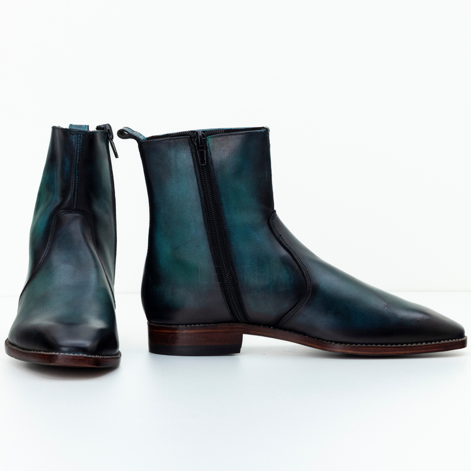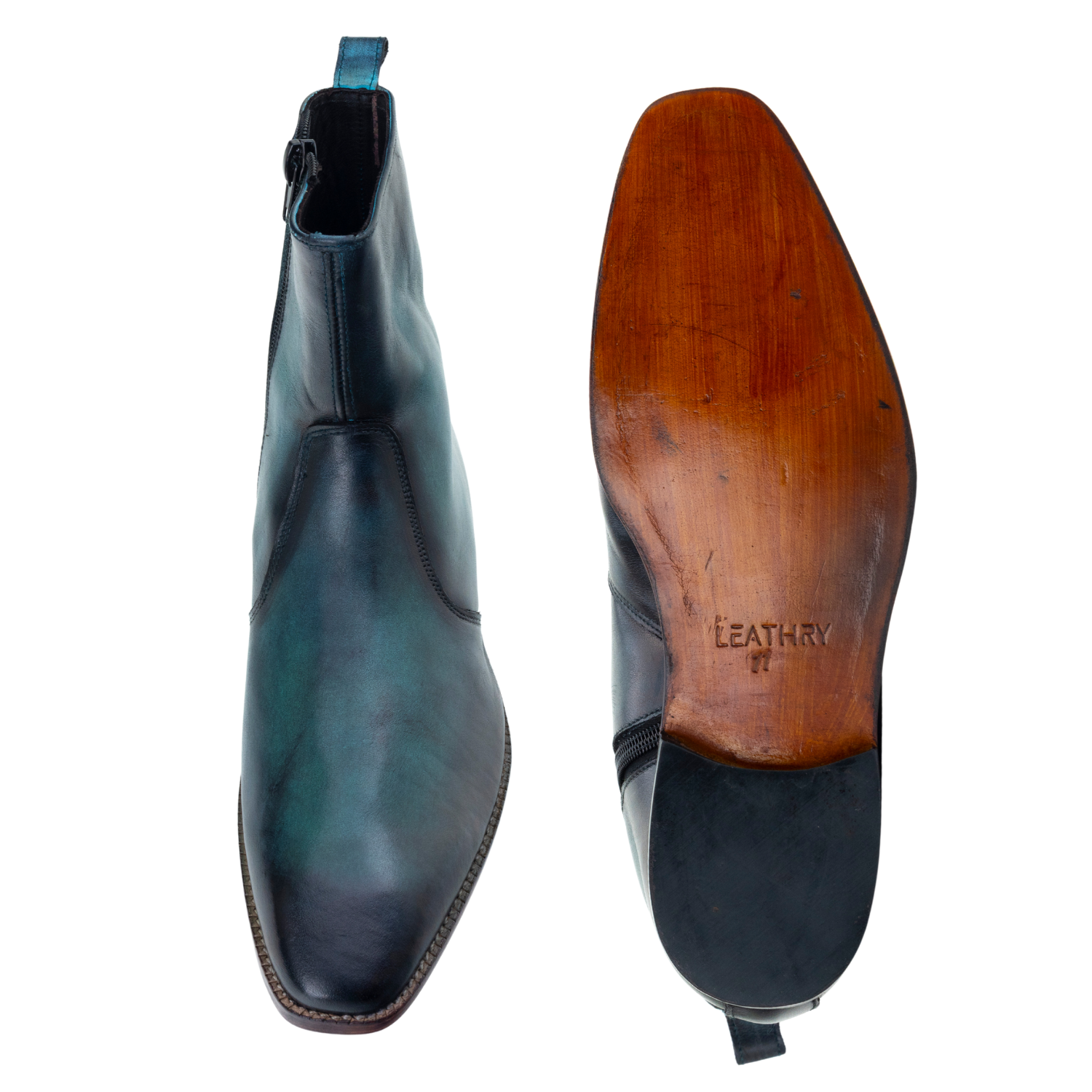 The Ulan is a bold men's ankle boot featuring a hand-burnished turquoise patina, crafted in 100% calf leather. With a sleek almond toe, side zipper closure, and Goodyear welted sole, it’s where striking design meets artisan quality.